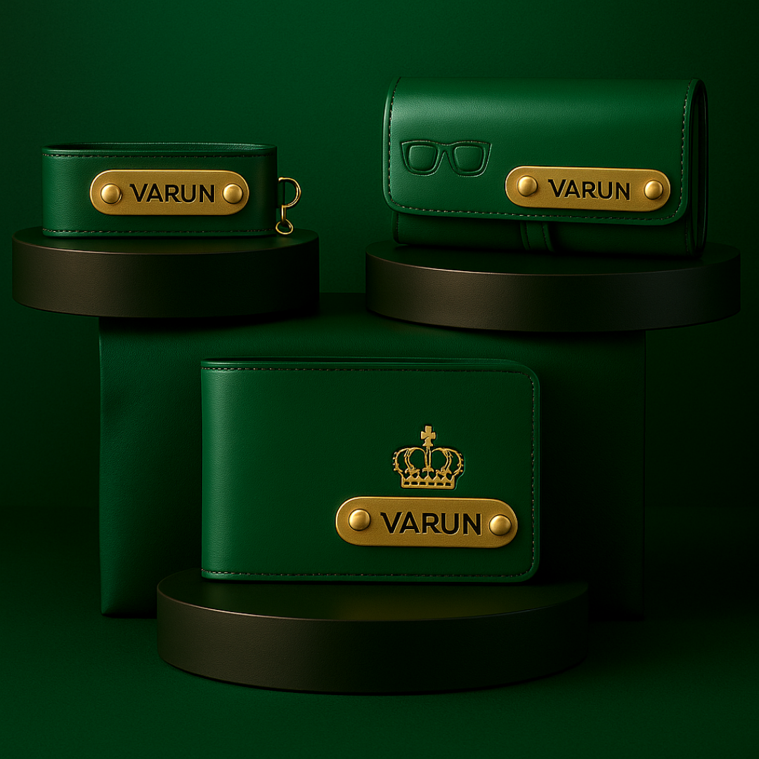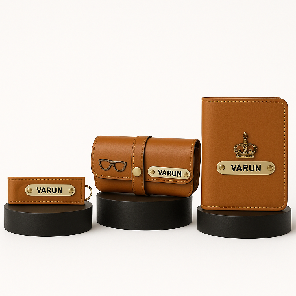 The centerpiece of this set is a meticulously crafted wallet, customizable with your name or initials, ensuring a touch of distinction in every detail. Complementing this elegant wallet is a stylish sunglasses cover, designed to protect your eyewear with finesse. The addition of a bespoke keychain adds a touch of personal flair to your daily essentials, while the passport cover, personalized to your liking, combines functionality with a sophisticated aesthetic for your travel needs.